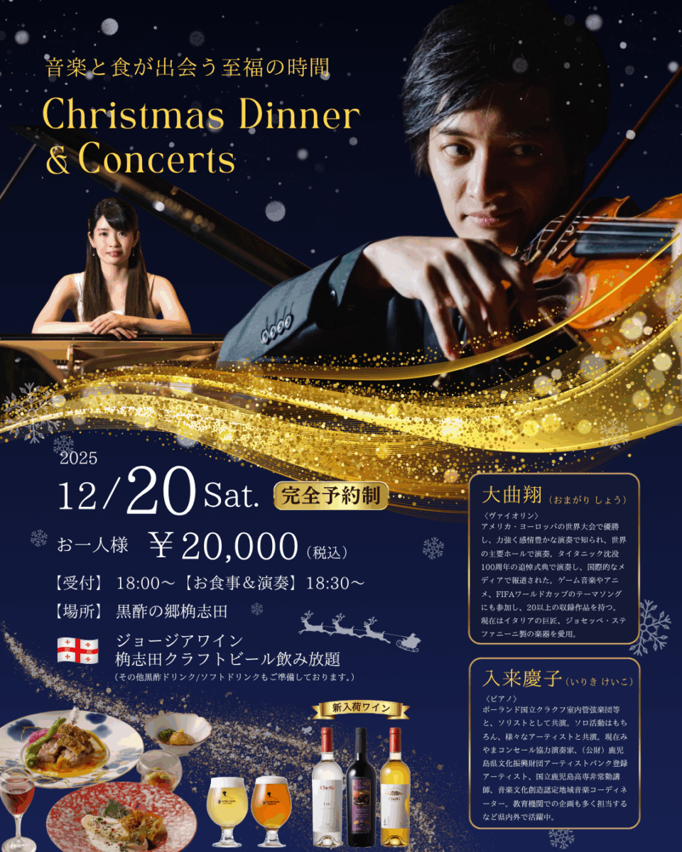 若き天才ヴァイオリニスト大曲翔さんと弊社レギュラーピアニストの入来慶子さんが奏でる演奏と黒酢のスペシャルディナーをおたのしみください。